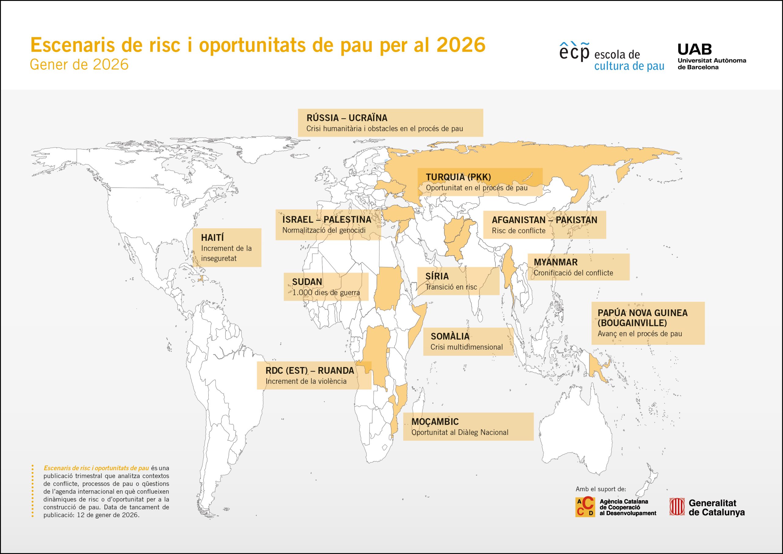 Escenaris de risc i oportunitats de pau és una publicació trimestral que analitza contextos de conflicte, processos de pau o qüestions de l’agenda internacional en què conflueixen dinàmiques de risc o d’oportunitat per a la construcció de pau. És una eina analítica que integra la perspectiva de gènere interseccional i que pretén ser un recurs útil per a actors educatius i polítics i la ciutadania en el seu conjunt, contribuint a la comprensió d’ aquests contextos i a l’acció preventiva.